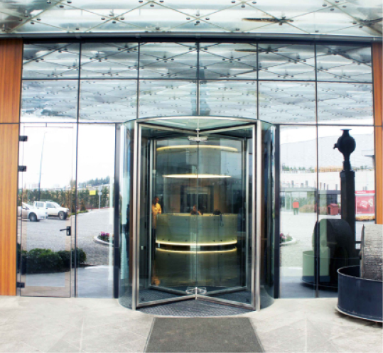 It is designed to give as much transparency into and out of the building as possible. It will provide you with the insulation and smooth traffic flow of a standard revolving door and creates a more contemporary main entrance feature.